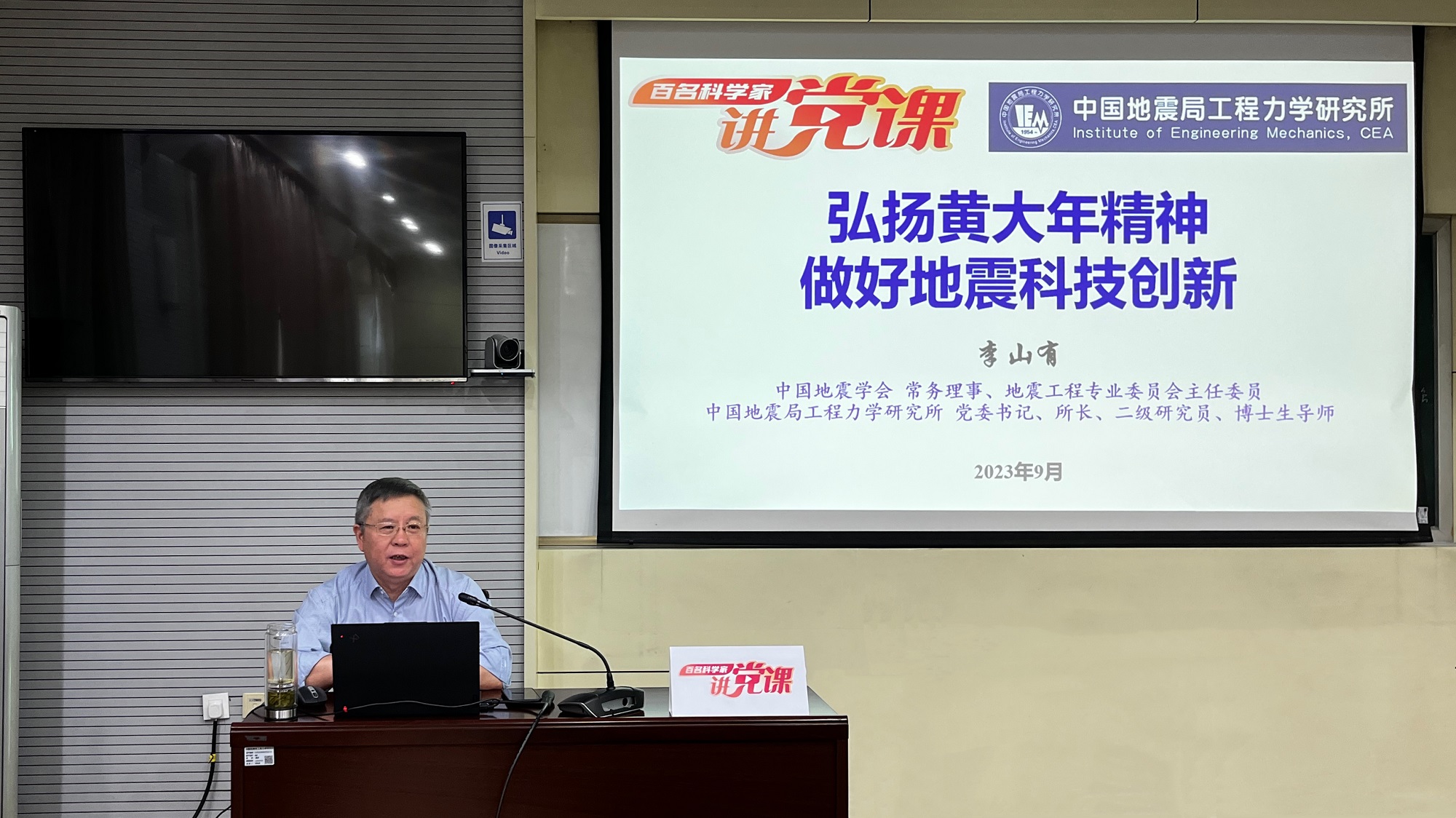 發(fā)布時(shí)間: 2023-09-15 點(diǎn)擊數(shù)量:12755為有效發(fā)揮中國(guó)科協(xié)黨校全國(guó)學(xué)會(huì)分校政治引領(lǐng)“主陣地”、黨性錘煉“大熔爐”作用,中國(guó)科協(xié)科技社團(tuán)黨委組織開展了“百名科學(xué)家講黨課”活動(dòng)。受中國(guó)地震學(xué)會(huì)邀請(qǐng),9月14日,中國(guó)地震學(xué)會(huì)常務(wù)理事、地震工程專業(yè)委員會(huì)主任委員,我所黨委書記、所長(zhǎng)李山有同志以《弘揚(yáng)黃大年精神 做好地震科技創(chuàng)新》為題為所辦計(jì)財(cái)黨支部、工程地震研究中心黨支部及碩士研究生第二黨支部講授專題黨課。