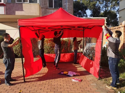接到檢測點遷移指令后,支部黨員干部又緊急集結,調用研究所應急帳篷在居民區(qū)空曠場地連夜搭設核酸檢測點,和下沉黨員一起建立引導區(qū),鋪貼安全線,迅速完成應急設備的安裝調試,保證核酸檢測工作順利進行。為避免帳篷被大風翻卷,物資受損,室外核酸檢測點每日都要重新搭建。為了讓社區(qū)工作人員充分休息,支部黨員和志愿者凌晨5時前到崗,確保各項準備工作在5時40分前就緒。每次檢測結束,他們又將全部設備設施收集整理,運回倉庫妥善保管。