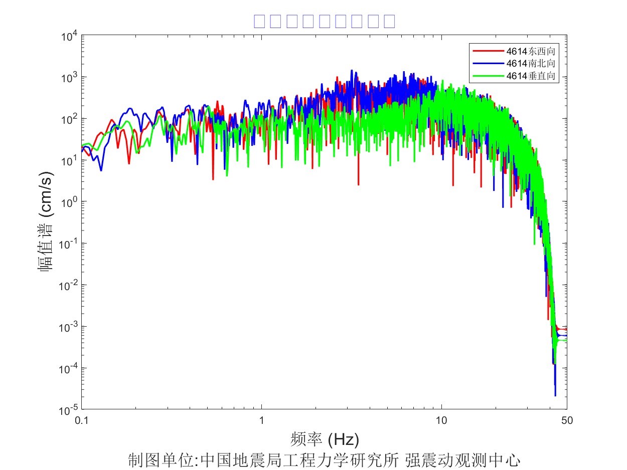 儀器地震烈度分布圖見圖1,地震峰值加速度分布圖見圖2,地震峰值速度分布圖見圖3,地震加速度反應(yīng)譜(T=0.3s、T=1.0s、T=3.0s)分布圖見圖4、圖5、圖6。4614臺(tái)強(qiáng)震動(dòng)記錄見圖7,4614臺(tái)加速度反應(yīng)譜見圖8,4614臺(tái)傅里葉幅值譜見圖9。