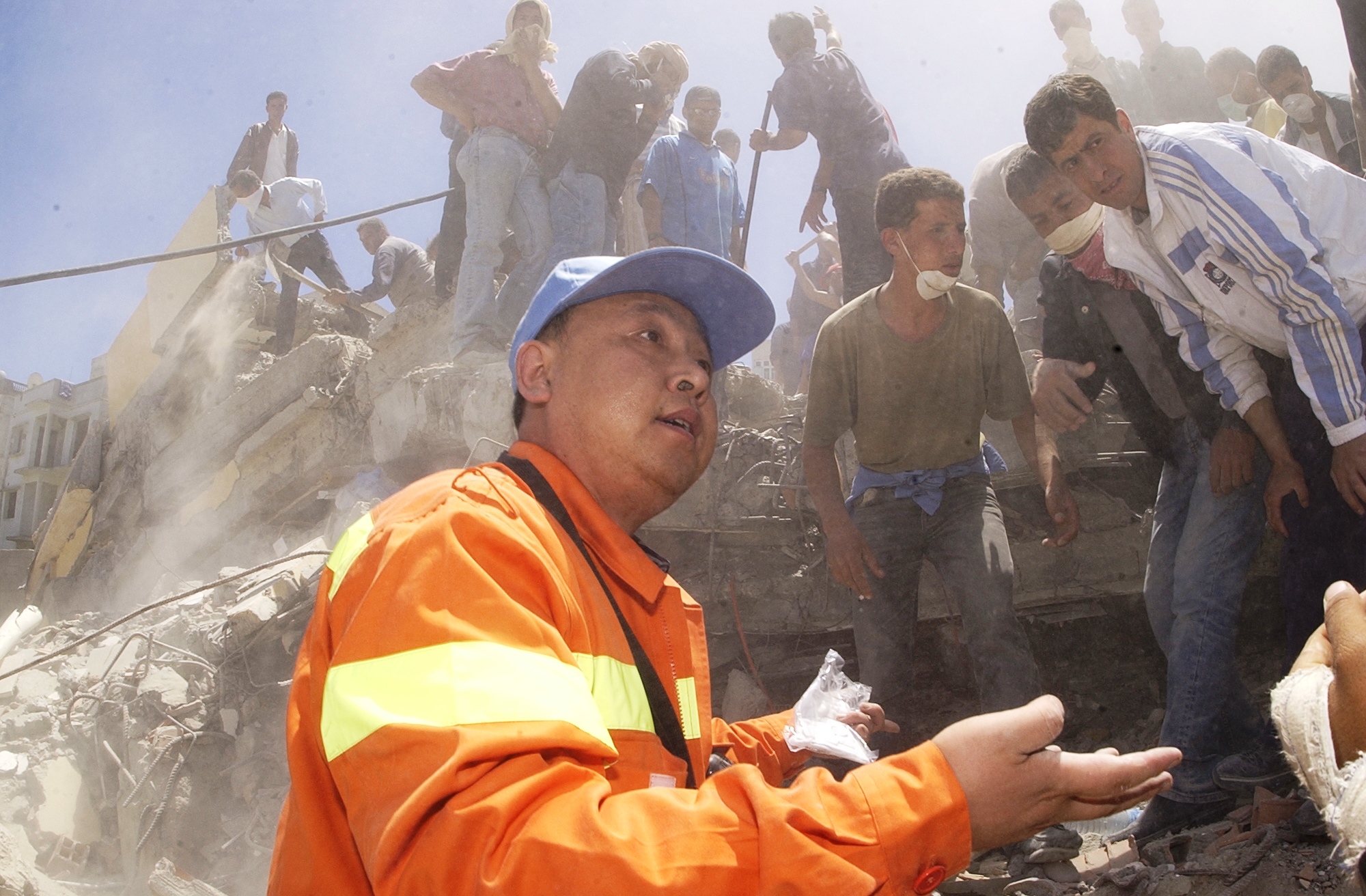 發布時間: 2023-08-02 點擊數量:8754走進位于哈爾濱市南崗區的中國地震局工程力學研究所(簡稱“工力所”),文化墻上的一幅照片格外引人注目:震后的斷壁殘垣間,深膚色卷頭發的救援人員圍住一位中國專家,他身穿橘黃色國際救援隊服,正全神貫注地講解著。這是工力所二級研究員、博士生導師孫柏濤,作為中國國際救援隊專家參與指導2003年阿爾及利亞地震現場救援的場景。