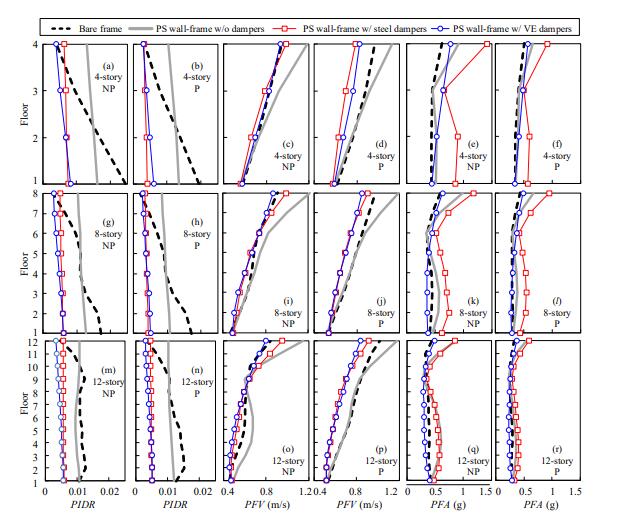 鉸支墻可以增加結構沿高度方向的連續剛度并使層間位移分布更為均勻,從而避免框架結構出現薄弱層破壞。然而,現有研究對鉸支墻-框架結構的樓面速度和加速度反應關注較少,而這些反應主導了建筑物非結構構件的地震損傷。本文通過數值模擬評估了鉸支墻-框架結構的樓面速度和加速度反應,重點研究了使用不同類型阻尼器對其的影響。此外,還通過結合最大峰值層間位移角、平均峰值樓面速度和平均峰值樓面加速度作為工程需求參數進行了多維地震易損性分析。