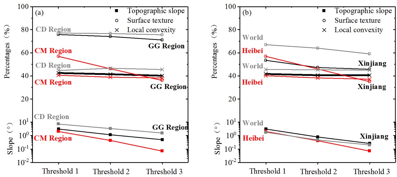 圖3三項(xiàng)地形特征參數(shù)(坡度、紋理及凸度)的閾值:(a)首都圈、川滇及兩廣地區(qū);(b)新疆、河北省及全球