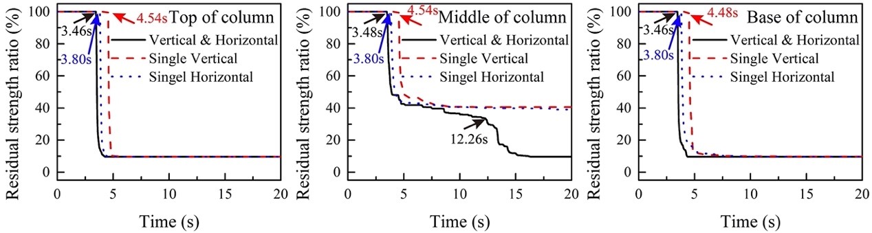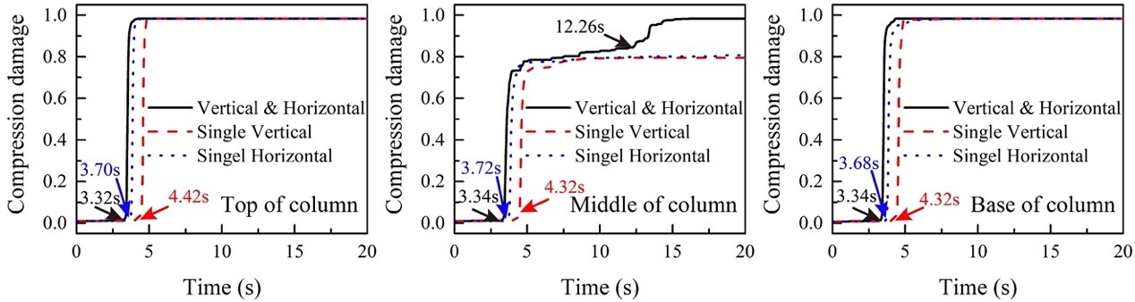 2.本文依據大開車站的震害調查資料,建立三維非線性有限元模型(見圖3),采用時域動力顯式有限元分析方法重現了大開車站在雙向地震動共同作用下的坍塌過程及其“M”型破壞模式(見圖4),給出了中柱混凝土實效演化過程(見圖5)。