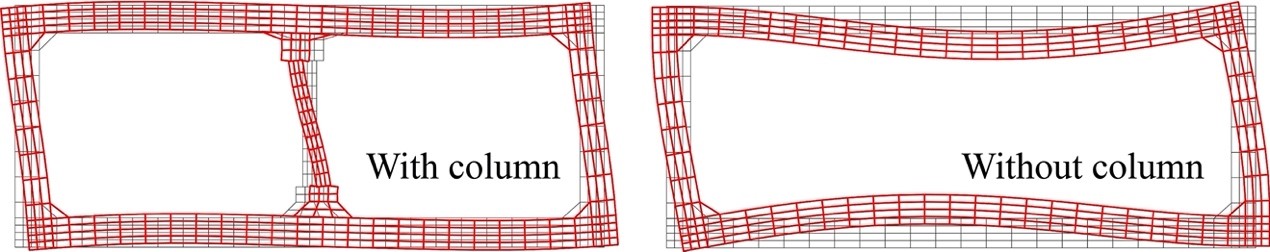 3.根據數值模擬得到的結構變形演化過程(見圖6),可以將大開車站的破壞分為三個階段:I)中柱在水平和豎向地震動共同作用下失效;II)中柱承擔的上覆土和后續地震荷載向頂板轉移,并引起頂板混凝土損傷發育;III)頂板破壞沉降引起結構整體垮塌。通過對比有無中柱截面的地震變形模式(見圖7),可知結構幾何形狀(頂板和側壁的剛度比)對地下結構的地震響應有很大的影響;頂板的剛度大于側墻的剛度,有利于地下結構的抗震。